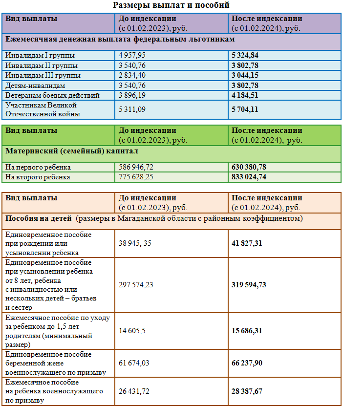 С 1 февраля ОСФР по Магаданской области проиндексирует на 7,4% ряд социальных выплат. Размер повышения определен постановлением Правительства на основе данных Росстата об уровне инфляции прошлого года. Это вторая волна массовых повышений с начала года после проведенной в январе индексации пенсий и изменения прожиточного минимума, по которому рассчитываются многие социальные выплаты и меры поддержки.