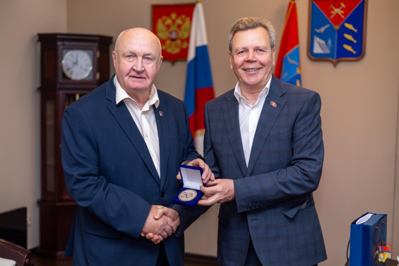 Спикер вручил экс-Председателю медаль к 30-летию Магаданской областной Думы и сувениры.