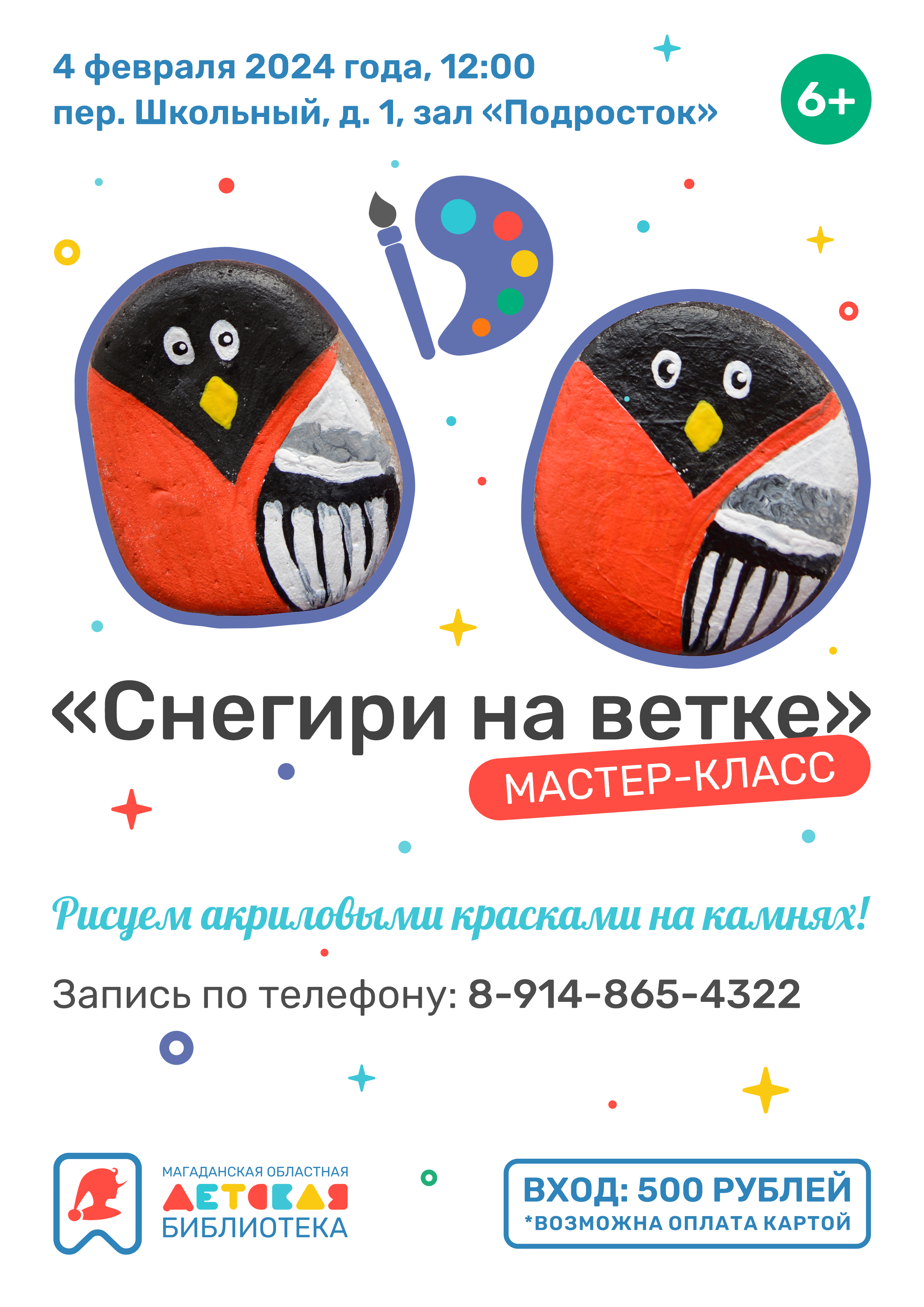 4 февраля в 13:00 приглашаем ребят от 12 лет на мастер-класс по изготовлению картины-поделки из камней «Снегири на ветке»!