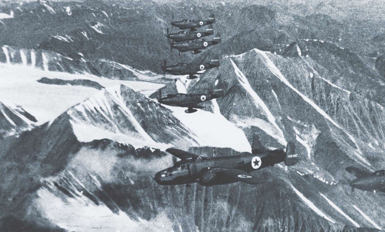 Группа Р-63 с лидером-бомбандировщиком В-25 над Верхоянским хребтом. Фото: https://www.kolymastory.ru/