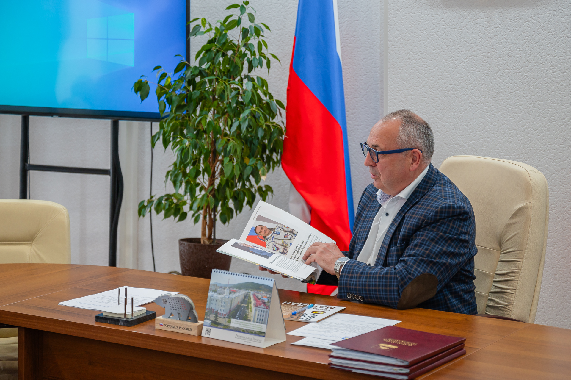 Глава муниципалитета поблагодарил земляков за визит в Магадан и преподнес гостям печатную сувенирную продукцию, выпущенную специально к двойному юбилею столицы территории.